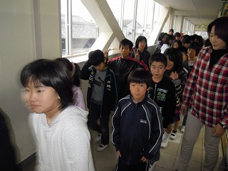 写真は、鑑賞中の3・4年生、廊下で整列をして次の教室へ向かう5年生 です。