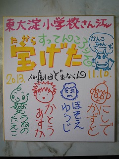 写真は、人形劇が始まる前のセットと劇団の色紙 です。