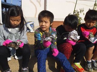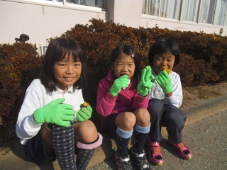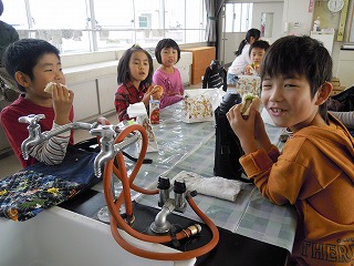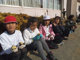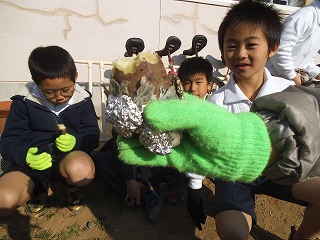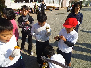 先日5年生が実施してくれた「焼いもパーティ」で、2限後の長い休み時間に全校が食べたようすです。