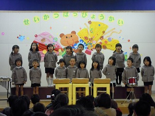 土曜日の今日、新入生の多くが入学する東大淀保育園の生活発表会に出かけてきました。年少さんより年下の園児から年長さん(みどり組)さんまで歌・おどり、合奏、そして劇と見ている人をほんわかさせる2時間でした。