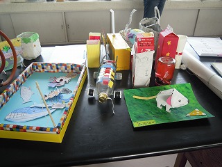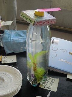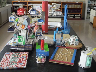 写真は、理科室にならべられた自由研究や創作品の数々、2年生と5年生の分と1年生の「あまちゃん?」です。