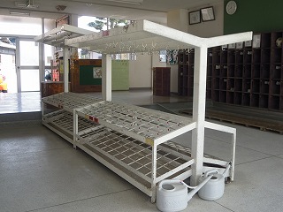 予定よりは遅くなりましたが、昨日、傘たてを切り、部品のようにして撤去、処分もしていただきました。これからは、移動用の傘たてとカッパかけを設置します。今は、昇降口、何もない状態ですので、「広い」ですよ!!!
