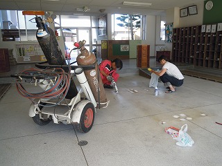 長年使っていた鉄の傘たてとカッパかけですが、狭い昇降口で幅をとって危ないなぁと、常々心配をしていたところ、今年度PTA副会長をしていただいている川村さんが快く撤去を引き受けてくださいました。