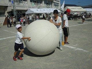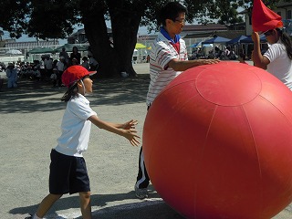 写真は、なめこダンスへの入場、全校綱引きのがんばり、大玉ころがし です。