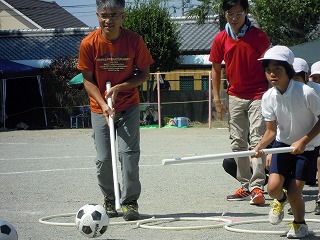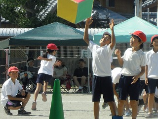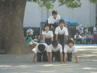 写真は、ペットボトル大作戦の疾走、ボール運びでの息の合ったプレイ、そして、引き継ぐ5年生イッキ!ピラミッドの一つ です。