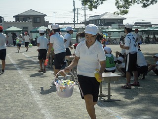 写真は、100M走の力走、ペットボトル輸送大作戦でのがんばり、そしてボール運びの親子の笑顔 です。