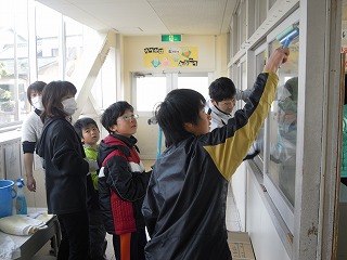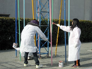 昨日3/3(日)、今年度最後のPTA行事、親子奉仕作業が行われました。少し寒い北風の中、6年生の親子とPTA本部役員・部会長さんが集まり、学校の高い所の窓拭き、1・2年生教室の飛散防止フィルム張り、遊具のペンキ塗り、体育館の窓拭きや屋根の掃除、をしていただきました。