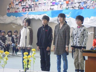 25日(月)1限目、平成25年度の修了式を行い、各学年の子どもたちの進級を認定しました。また、「より笑顔あふれる学校」をめざし、『やってみる』というチャレンジ・トライの姿勢が大切だということを子どもたちに訴えました。先日行われた子どもたちの児童会役員選挙での積極的な姿勢を褒め讃えて。