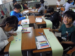 国語・国語・生活・生活・算数の時間割で、3・4限の生活では、くるくる巻きの長い色上質紙に、楽しいイメージの絵を描いて、それを棒に貼り、振ると飛び出す作品を作りました。真剣な顔、ニコニコ笑顔が印象的です。5限目の算数は、三角形について学習をしていました。