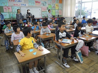 写真は、作品製作中の謙心君・桃愛さん、真喜志君・聖花さん・大和君・翔真君、算数で先生の説明を聴く2年生 です。