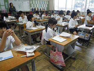 開放デーの日に、天候が「雨」で授業内容を変更したのが、3年生でした。晴れれば、保護者の方々と子どもたちで、太陽の動きを日時計の形で観察する準備をしていましが、あいにくの一日雨!!!
