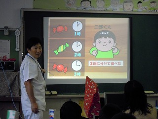 写真は、お話をする長井先生とその質問に手を挙げる4年生、歯磨きをがんばっている和輝君と隆吾君 です。