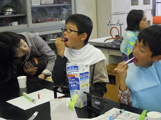 午後は、長井先生の歯の指導、虫歯はこうやってなるんだ、というお話とみんなの歯垢の残りを確認しての歯磨き指導をしていただきました。みんな、自分の歯に食べかす等がある赤い色を見て、大騒ぎでした。