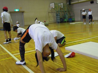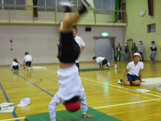 写真は、マット運動の技 倒立前転の男子、ブリッジをきれいに決める女子、そして6限目のなごやかな笑の中の授業 です。