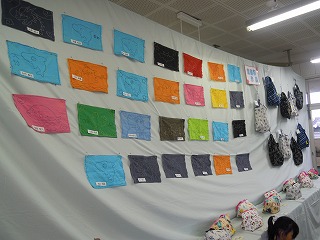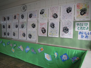写真は、1年の『やさいがとれたよ、すてきなおかお』(版画)、2年の『にじいろのさかな』(アルミ箔制作)、バザーの前でにっこりの叶翔君と理央奈さん です。