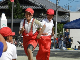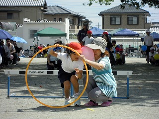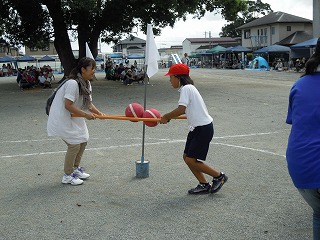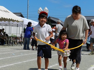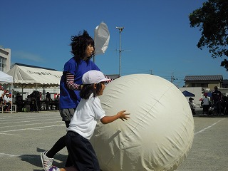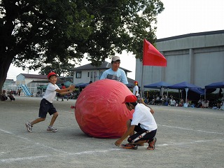 写真は、5・6年生「ペットボトル輸送大作戦」の梨紗さんの疾走、1・2年親子競技「大玉スクランブル」の栞奈さんとお母さん、裕実君とお父さん です。
