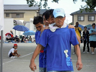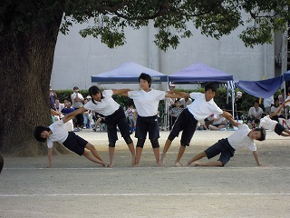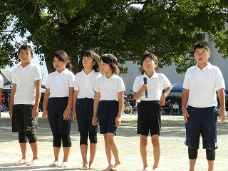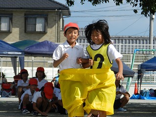 写真は、3・4年競技「こけるなワッショイ」。大きくカラフルなパンツに二人が入っての激走!楽しそうですね。龍音君と夏媛さん、暁君と未葵さん、そして組立体操「かがやき」の最初のナレーションをする5・6年生 です。明日は、最後、組立体操の3種類をお知らせします。