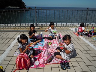 写真は、アザラシにさわる1・2年生、1年生全員の記念写真、そして、2年生女子のおいしそうな昼食風景 です。