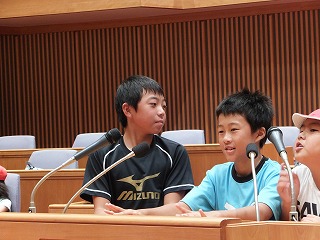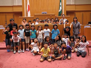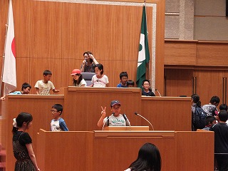 写真は、議場での議長席や答弁席に実際すわらせてもらう子どもたち、質問席に立つ豪君・亮輝君・龍音君、議場での3・4年生全員の記念撮影 です。