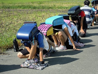 写真は、2年生の手をつないで避難する5年生、そして農道で姿勢を低くする4年生 です。