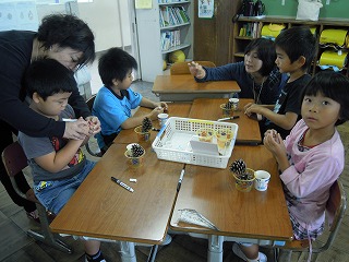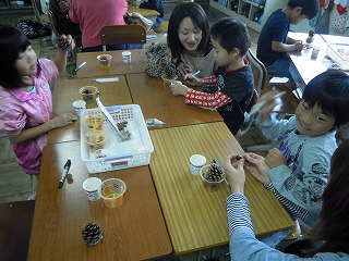 まず、1年生。国語・算数・生活・生活・国語の授業でした。3・4限の生活では、親子で、松ぼっくりとどんぐりにデザインをして、「トトロ」を作る授業でした。ホットボンドという新兵器接着剤で、松ぼっくりとどんぐりをくっつける役を保護者の方々に交代でしていただきました。かわいい「トトロ」がたくさんできました、よかったね。