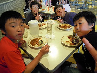 写真は、早い昼食カツカレーをぱくつく元気な男子、お化け屋敷の前で、忍者をまねる晴天君