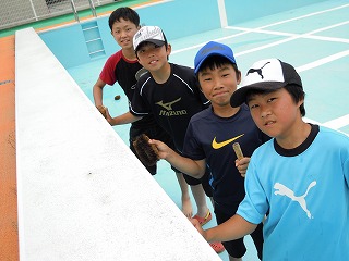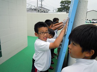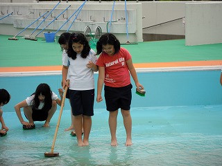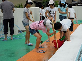 続いては5年生。ベビープールとその周辺担当。残念ながら、ぺビープールはこの日は排水が詰まっており、水がうまく流れない悪条件の中、プールの壁やプールサイドのフロアをきれいにしてくれました。水の中のアメンボやおたまじゃくしに驚いたり、喜んだりしながら・・・お疲れ様!!