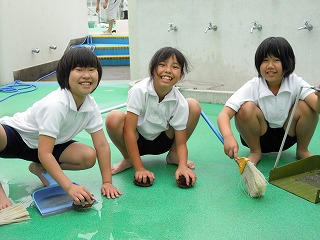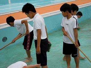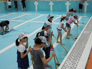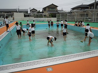 6年生は、メインプールの掃除。やはり、プール掃除も2年目になると、慣れたもの。スリッパやタオルを準備して、プールのフロアと壁をこすり、最後は、プールサイドの溝をきれいにしてくれました。雨が降らずに良かったね!!