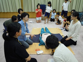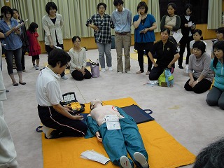 先週6/22(金)の夜、町民会館にて35名の参加で、救命救急法講習会が開かれました。自由水泳が始まる夏休み前に例年行われているものですが、今回も、熱心な講師先生のもと、人形を使っての人口呼吸心臓マッサージ、AED装置の操作を実際に一人ひとりが真剣に演習させてもらいました。