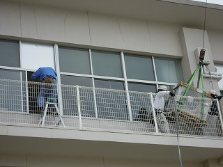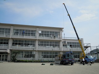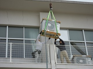 遅れていた教室の空調工事(エアコン設置)が始まりました。ありがたいことに、薄曇りで少し涼しい気候の下、クレーンを使い3階、2階へと室外機や本体が運び込まれいます、今午前9時。