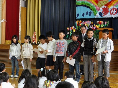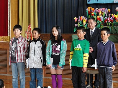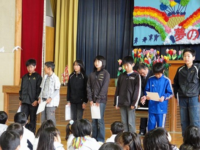 今日の集会は認証式を行いました。児童会役員、通学団長、委員会委員長、学級委員が認証されました。みんな学校全体のために一生懸命仕事をしてくれることでしょう。