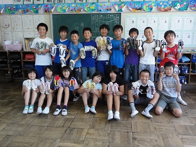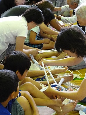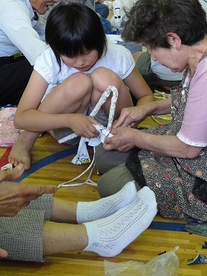 宅老所「もんちゃん」のお年寄りの方々を迎えて、お年寄りや保護者の方々の指導の下に、5年生は布ぞうり作りを体験しました。想像してたより上手にできて、みんな大喜びでした。