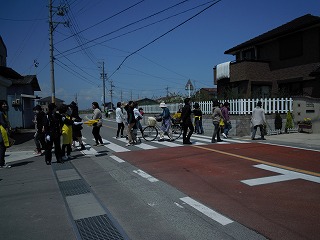 伊勢署の交通安全課の方の実地指導の簡単な講習の後、実際に横断歩道で「歩行者役」と「交通安全指導員の役」とに分かれて、演習をしました。写真はその模様です。みなさん、お疲れ様でした。そして、ありがとうございました。