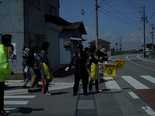 例年より早く、本日11時15分より、JA東大淀前で、PTA交通安全母親の会が主になっていただき、街頭指導実地研修会を開きました。お忙しい中、PTA会長さん初め23名の会員の方に集まっていただき、晴天の中、行いました。