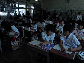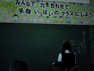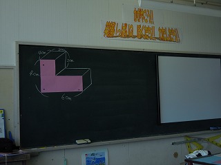 授業風景第一弾です。6年は、算数。今まで学習してきたこととは逆に、式からその式にあてはまる問題文を作ろう、という課題でした。5年も算数。黒板に貼られてある立体の体積を求めるには?という課題でした。はたして、うまくできたかな?