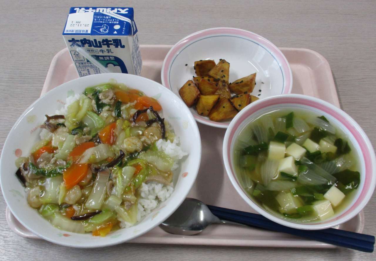 今日の給食は・・・中華飯、牛乳、わかめスープ、大学芋です。
