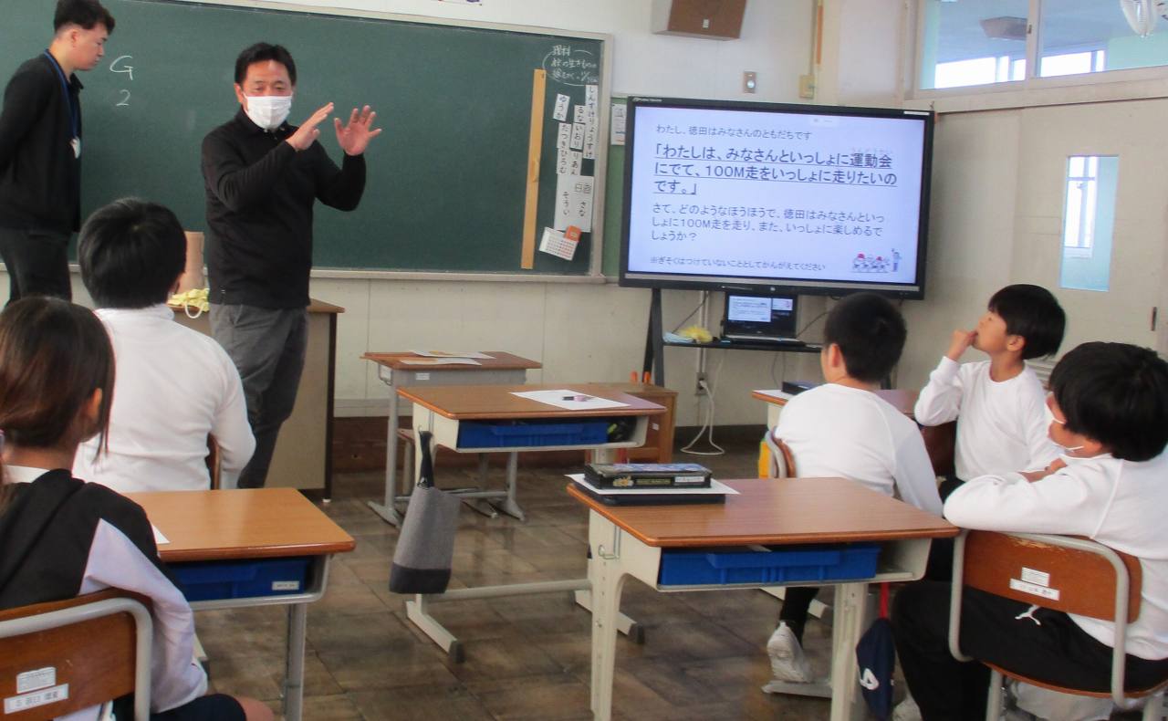 今日は、4年生対象の、障がい者キッズサポーター教室ののため、徳田さんと山口さんに来ていただきました。