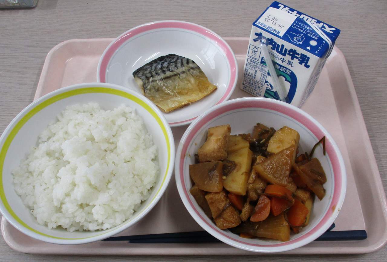 今日の給食は・・・麦ごはん、牛乳、サバの塩焼き、味噌煮込みです。