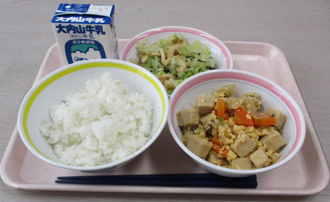 今日の給食は・・・麦ごはん、牛乳、高野豆腐の卵とじ、キャベツと小松菜のひたしです。
