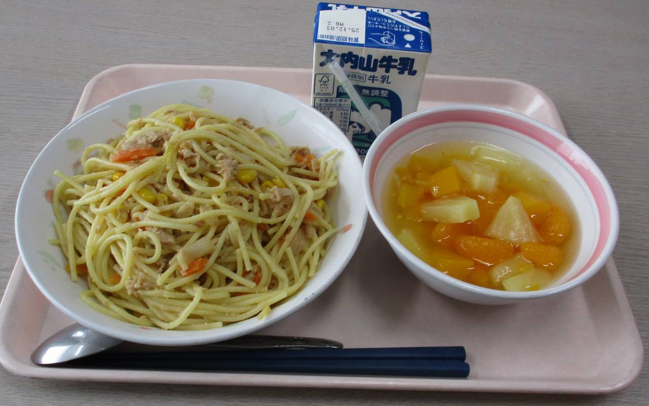 今日の給食は・・・ツナしょうゆスパゲティ、牛乳、フルーツポンチです。
