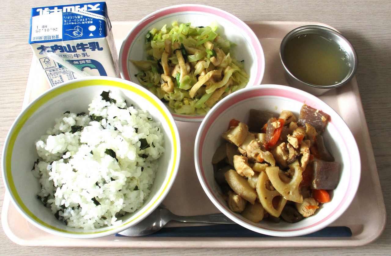 本日の献立は、わかめごはん、牛乳、筑前煮、キャベツと小松菜のひたし、手作りリンゴゼリーです。