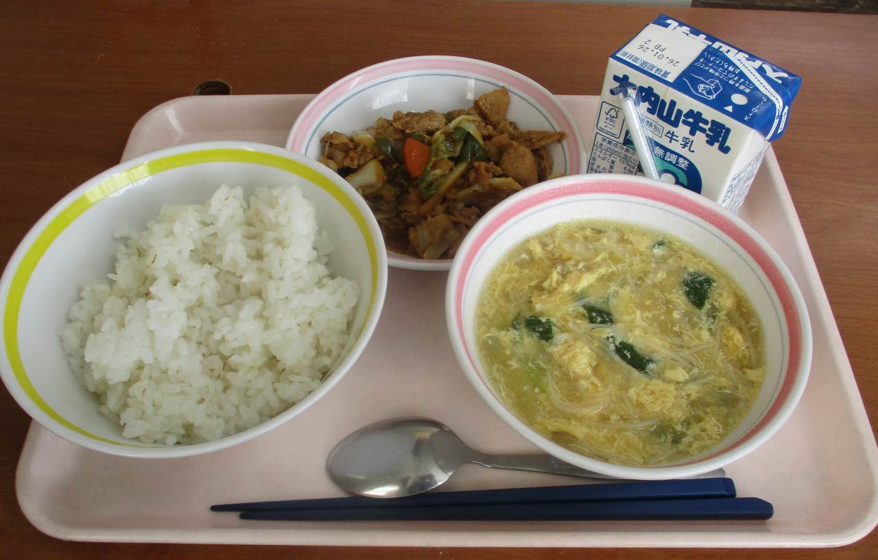 今日の給食は・・・麦ごはん、牛乳、ホイコーロー、ビーフンたまごスープです。