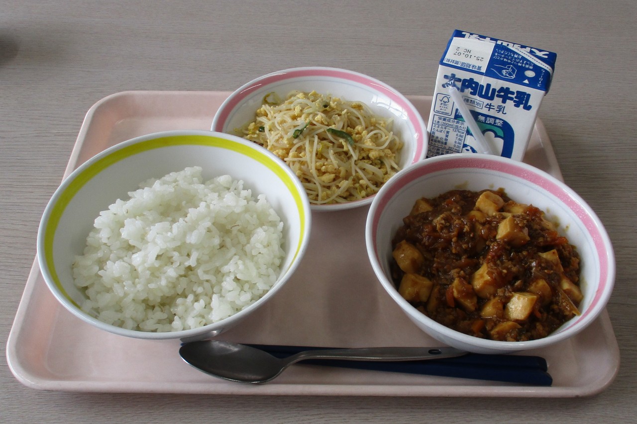 今日の給食は・・・麦ごはん、牛乳、麻婆豆腐、ビーフンの中華サラダです。