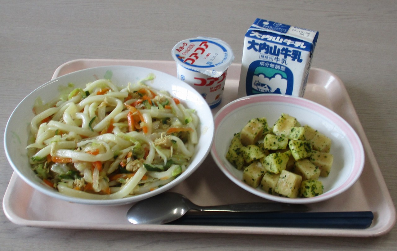 今日の給食は・・・サラダうどん、牛乳、高野豆腐とジャガイモの青のり揚げ、ヨーグルトです。