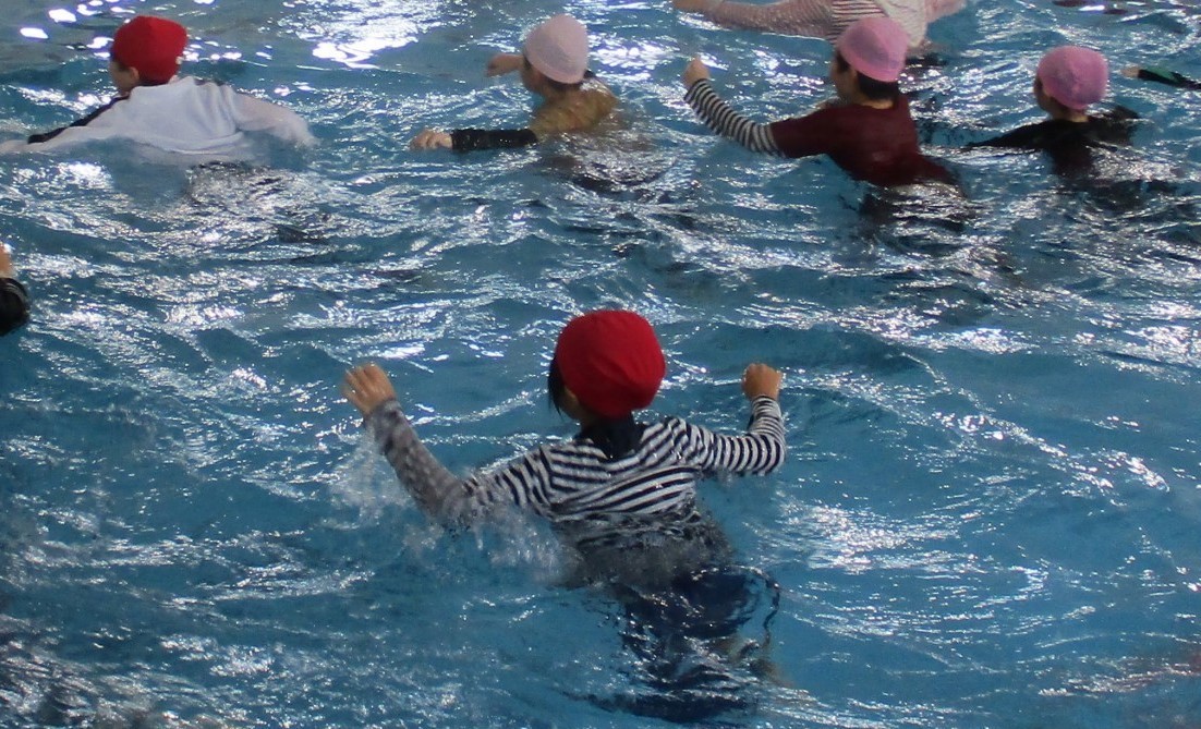 長袖・長ズボンのまま、水に入った子どもたちは、「重い〜。」「身動きがとれない〜」と、水の抵抗を体感しました。