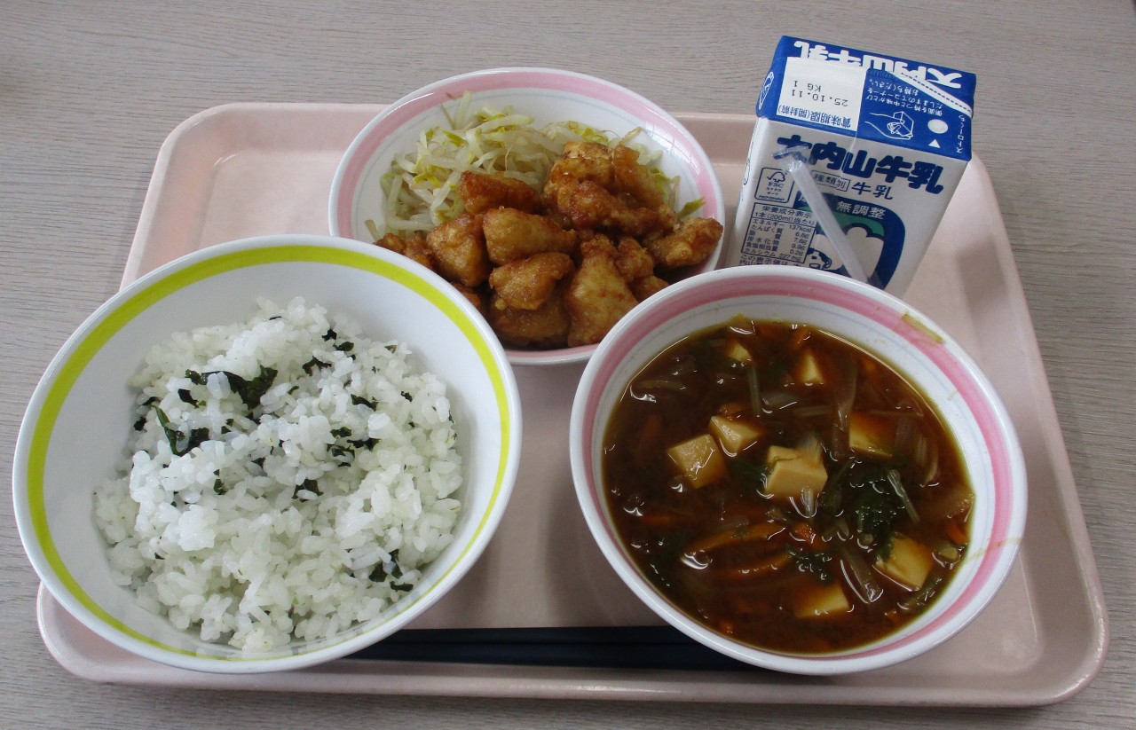 今日の給食は・・・わかめごはん、牛乳、とりのあげに、もやしのひたし、みそ汁です。