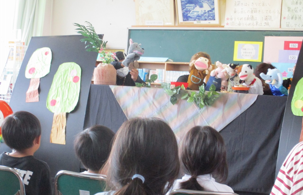 図書室が人形劇に会場に早変わり、すてきなセットの中で、劇を見せていただきました。