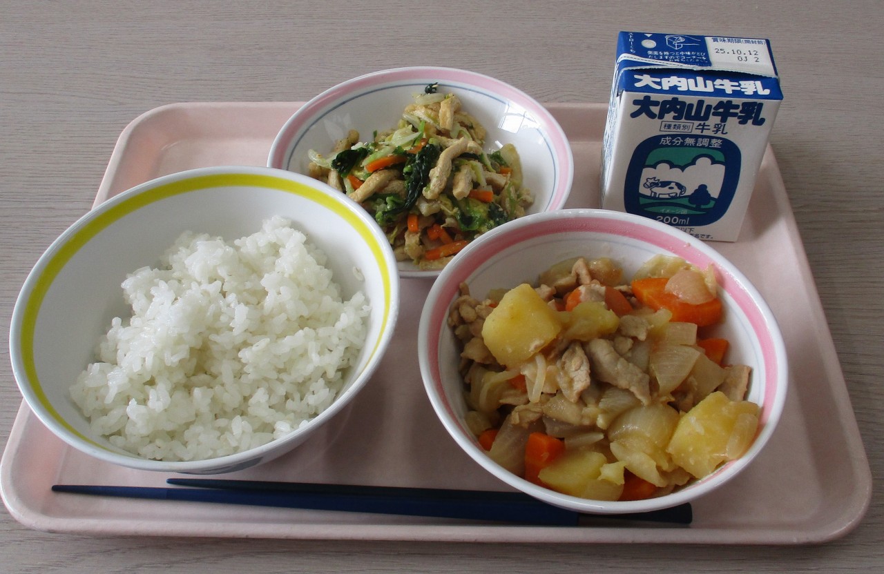 今日の給食は・・・麦ごはん、牛乳、肉じゃが、ごまあえです。