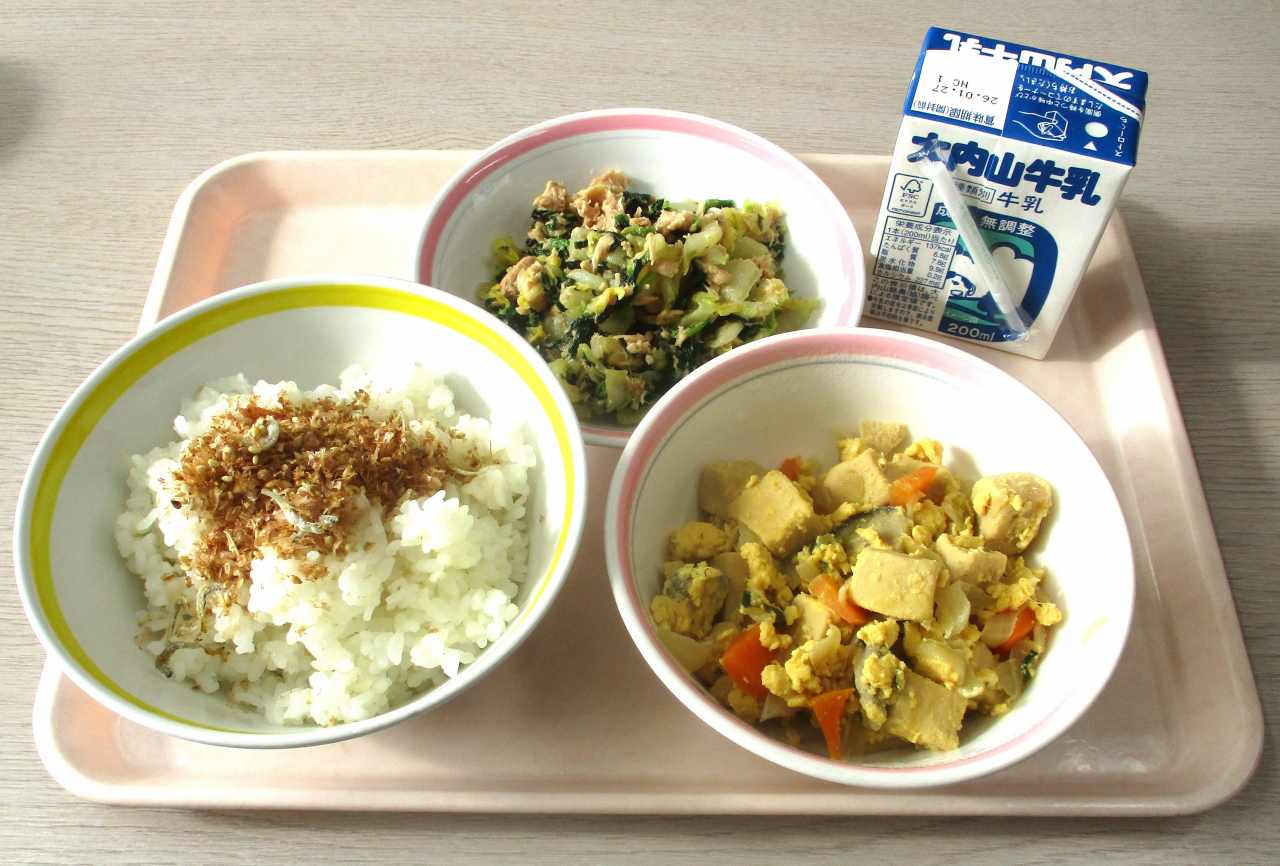 今日の給食は、麦ごはん、牛乳、高野豆腐の卵とじ、のりあえ、手作りふりかけです。