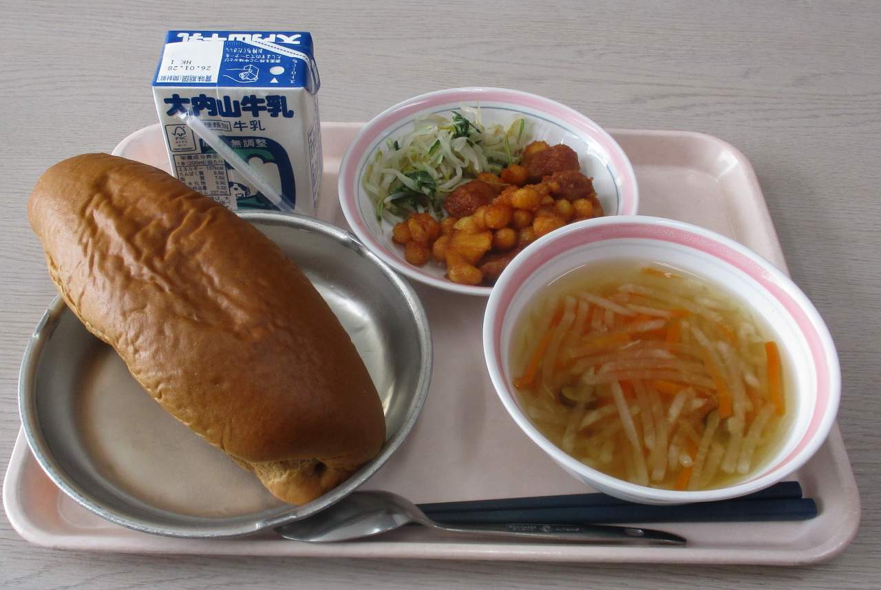 今日の給食は・・・黒糖パン、牛乳、カツオと大豆と芋のケチャップがらめ、大根としめじのスープ、添え野菜です。